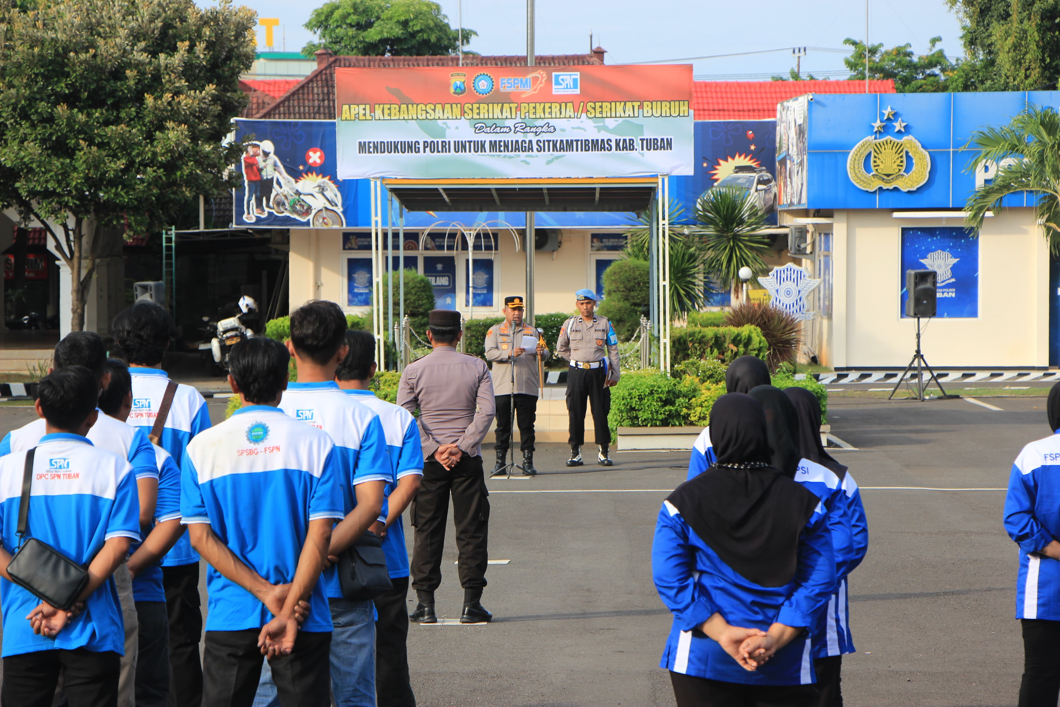 Tubankab - Guna memperkuat semangat persatuan dalam menjaga kondusivitas wilayah kabupaten Tuban, Polres Tuban kembali menggelar apel kebangsaan yang kali ini menggandeng unsur serikat pekerja dan buruh yang ada di Kabupaten Tuban.