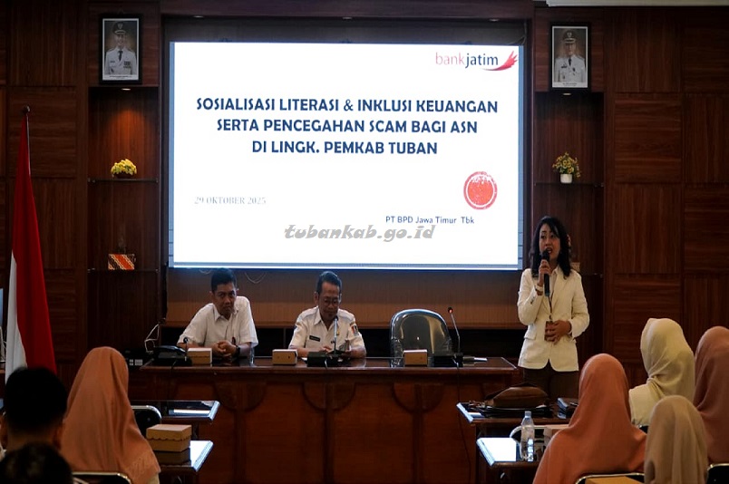Tubankab - Dalam rangka meningkatkan literasi dan inklusi keuangan serta mengantisipasi maraknya aksi penipuan keuangan di lingkungan aparatur, Pemkab Tuban melalui Bagian Perekonomian, Sumber Daya Alam dan Administrasi Pembangunan menyelenggarakan kegiatan Sosialisasi Literasi dan Inklusi Keuangan serta Pencegahan Scam bagi ASN di Lingkungan Pemkab Tuban di Ruang Rapat Dandang Watjono, Lantai 1 Setda Tuban, Rabu (29/10).