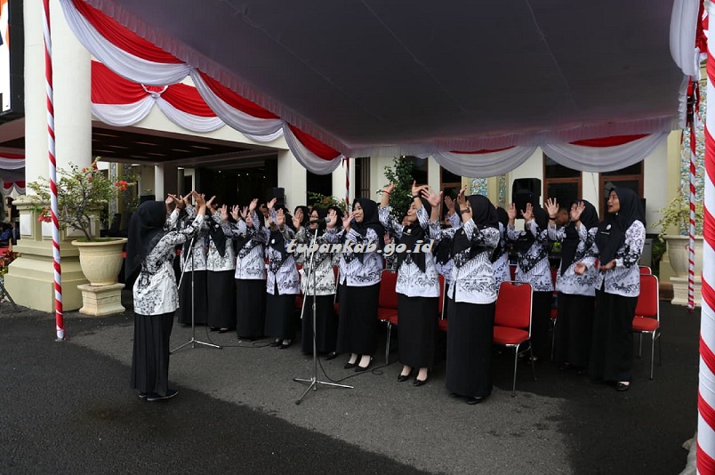 Salah satu yang memberi warna tersendiri pada pelaksanaan upacara ini adalah penampilan Regu Paduan Suara PGRI Cabang Tuban, binaan Ketua PGRI Cabang Tuban, Kasmulik, S.Pd., M.Pd.