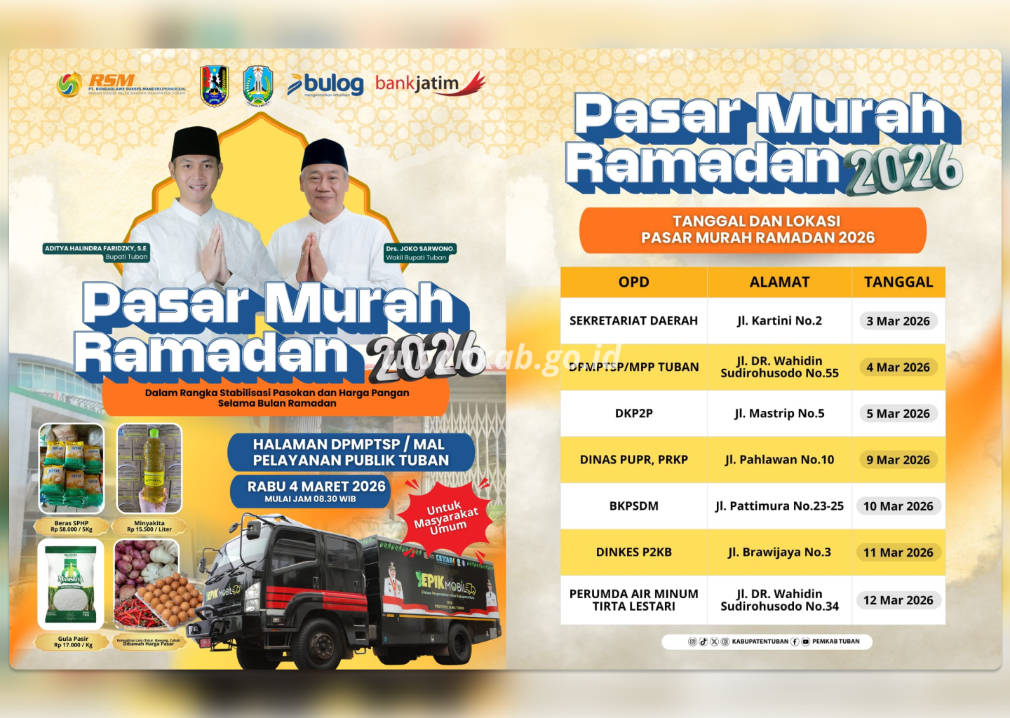 Selain itu, khusus pada Rabu, 4 Maret 2026, pasar murah di halaman Mal Pelayanan Publik Tuban akan diperkuat dengan kehadiran program EPIK Mobile atau Etalase Pengendalian Inflasi Kabupaten/Kota dari Pemerintah Provinsi Jawa Timur. Program tersebut sebelumnya diluncurkan di Gedung Negara Grahadi.