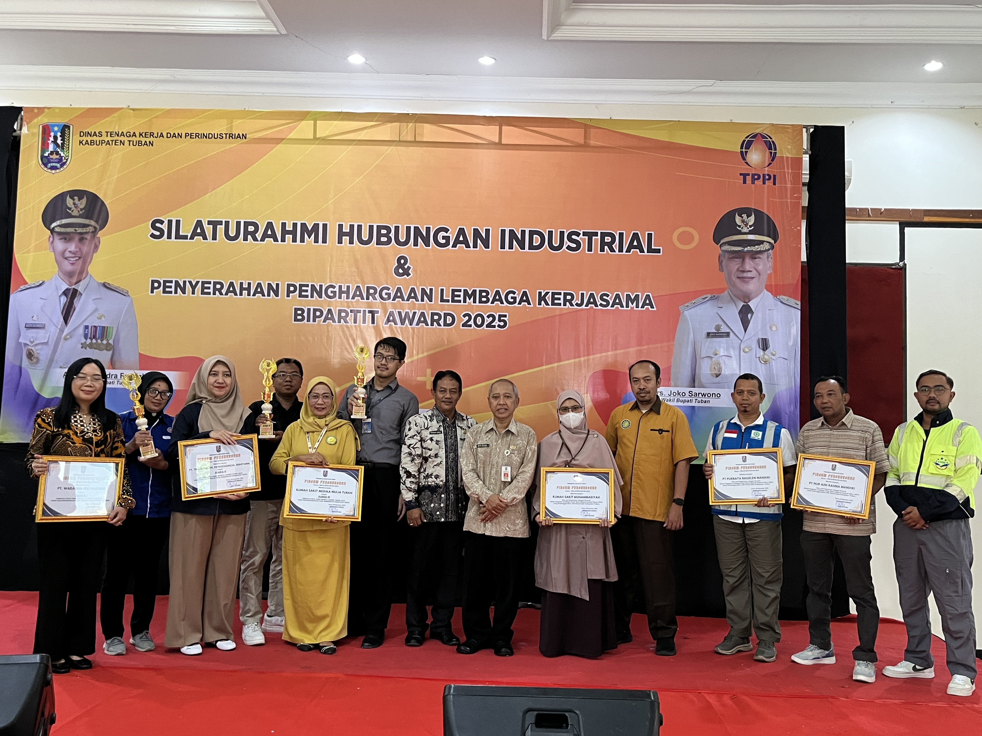 Pada kesempatan yang sama, Pemerintah Kabupaten Tuban menyerahkan penghargaan LKS Bipartit Award Tahun 2025 kepada 6 perusahaan yang dinilai aktif dan berhasil mengembangkan hubungan industrial yang efektif. Di antaranya; PT. Warahma Biki Makmur, PT. Trans-Pacific Petrochemical Indotama (TPPI), Rumah Sakit Medika Mulia, Rumah Sakit Muhammadiyah, PT. Purbaya Bagelen Mandiri, dan PT. Nur Aini Rahma Mandiri.