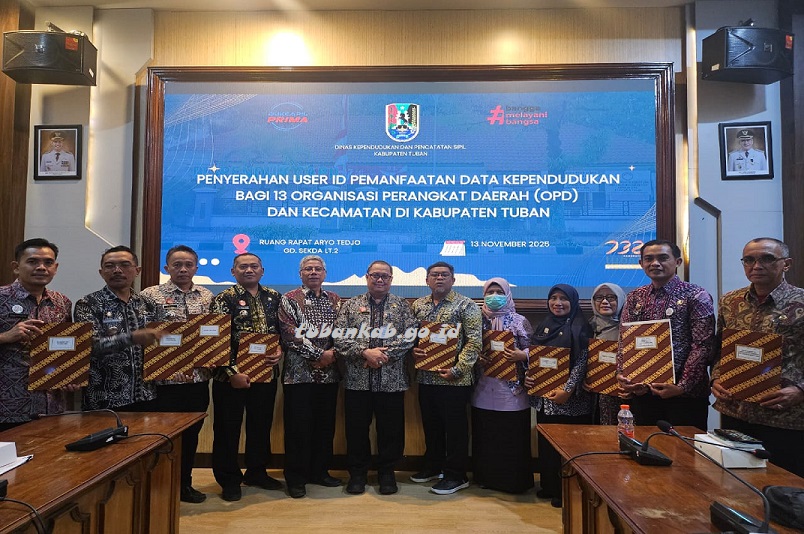Tubankab – Upaya memperkuat layanan publik di Kabupaten Tuban memasuki babak baru. Dinas Kependudukan dan Pencatatan Sipil Kabupaten Tuban resmi menyerahkan User ID Pemanfaatan Data Kependudukan kepada 13 OPD dan kecamatan dalam agenda yang digelar Kamis (13/11) di Ruang Rapat Aryo Tejo Sekretariat Daerah Kabupaten Tuban. Langkah ini membuka akses langsung bagi instansi untuk menggunakan data kependudukan terverifikasi sebagai dasar layanan.