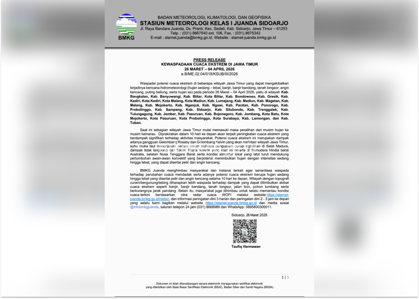 BMKG Stasiun Meteorologi Kelas I Juanda Sidoarjo mengimbau masyarakat untuk meningkatkan kewaspadaan terhadap perubahan cuaca yang terjadi secara mendadak. “Masyarakat diharapkan waspada terhadap perubahan cuaca mendadak serta adanya potensi cuaca ekstrem berupa hujan sedang hingga lebat yang disertai petir dan angin kencang,” tulis BMKG dalam rilisnya, Kamis (26/3).