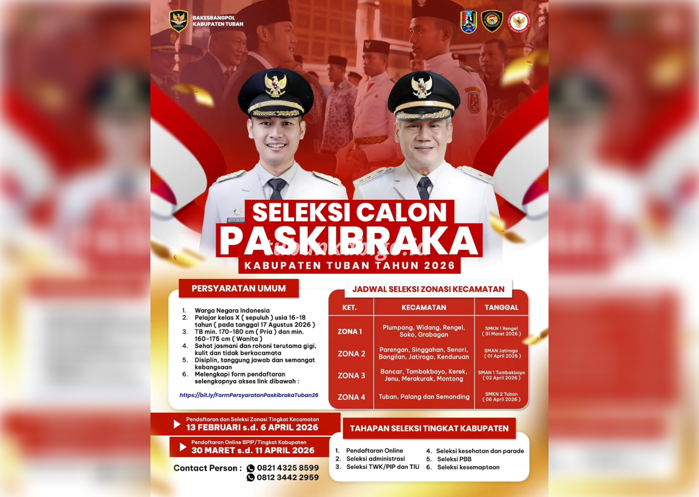 Untuk memudahkan proses pendaftaran, calon peserta dapat mengunduh formulir persyaratan melalui tautan https://bit.ly/FormPersyaratanPaskibrakaTuban26. Apabila membutuhkan informasi lebih lanjut, panitia menyediakan layanan kontak melalui nomor 0821 4325 8599 dan 0812 3442 2959. (yavid)
