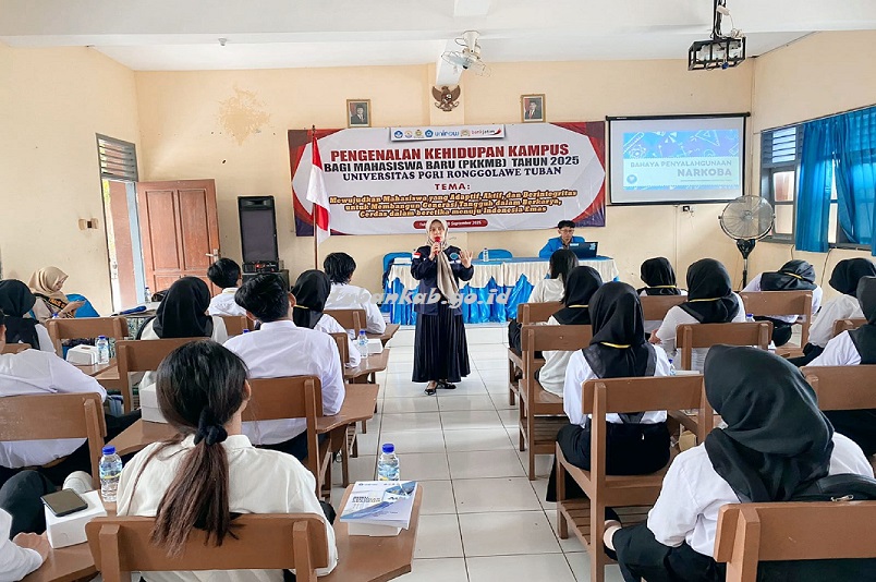Tubankab – Badan Narkotika Nasional (BNN) Kabupaten Tuban melaksanakan kegiatan sosialisasi Pencegahan, Pemberantasan, Penyalahgunaan, dan Peredaran Gelap Narkoba (P4GN) dalam rangkaian kegiatan Pengenalan Kehidupan Kampus bagi Mahasiswa Baru (PKKMB) di Universitas PGRI Ronggolawe (Unirow) Tuban, Kamis (18/09).