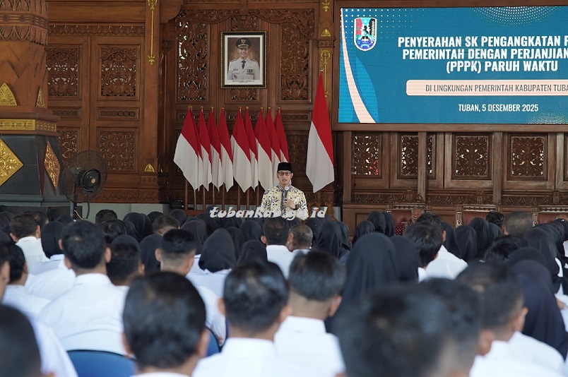 Tubankab - Bupati Tuban menyerahkan Surat Keputusan (SK) Pegawai Pemerintah dengan Perjanjian Kerja (PPPK) Paruh Waktu kepada 693 pegawai. Penyerahan SK dilaksanakan Jumat (5/12) di Pendapa Krida Manunggal Tuban sebagai bagian dari penguatan kebutuhan tenaga administrasi dan layanan operasional di lingkungan Pemerintah Kabupaten Tuban.