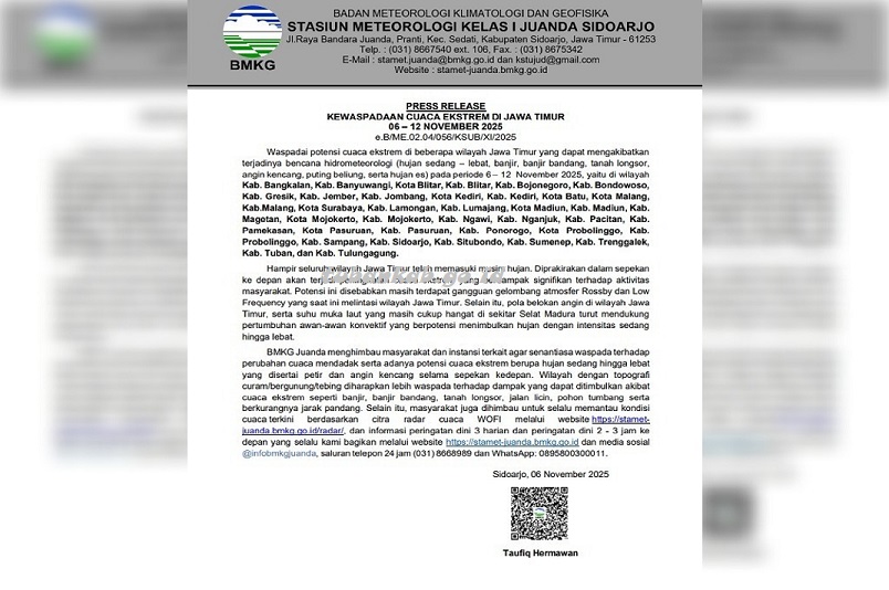 Tubankab – Badan Meteorologi, Klimatologi, dan Geofisika (BMKG) Stasiun Meteorologi Kelas I Juanda Sidoarjo mengeluarkan peringatan dini potensi cuaca ekstrem di wilayah Jawa Timur yang berlaku pada 6 hingga 12 November 2025. Peringatan tersebut disampaikan melalui surat resmi bernomor e.B/ME.02.04/056/KSIJ/XI/2025 tentang Kewaspadaan Cuaca Ekstrem di Jawa Timur, Kamis (6/11).