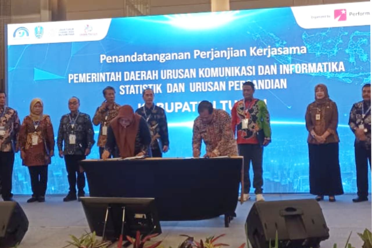 Tubankab - Pemerintah Kabupaten Tuban melalui Dinas Komunikasi dan Informatika, Statistik dan Persandian (Diskominfo-SP) turut ambil bagian dalam penandatanganan Perjanjian Kerja Sama (PKS) antara Pemerintah Provinsi Jawa Timur dan 10 kabupaten/kota dalam ajang Forum Pemerintahan Digital Jawa Timur 2025, bertajuk “Akselerasi Pemerintahan Digital dalam Mewujudkan Jawa Timur Gerbang Baru Nusantara”, yang digelar di Malang, Jumat (7/11).