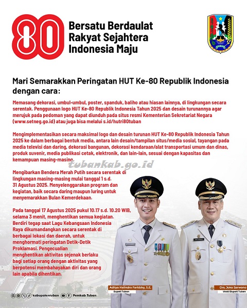 Tubankab — Pemerintah Kabupaten Tuban mengajak seluruh elemen masyarakat untuk bersama-sama menyemarakkan peringatan Hari Ulang Tahun ke-80 Kemerdekaan Republik Indonesia Tahun 2025. Seruan ini disampaikan melalui surat edaran resmi yang ditandatangani oleh Sekretaris Daerah Kabupaten Tuban, Dr. Ir. Budi Wiyana, M.Si dengan nomor: 400.14.1.1/4SII/414.031/2025.