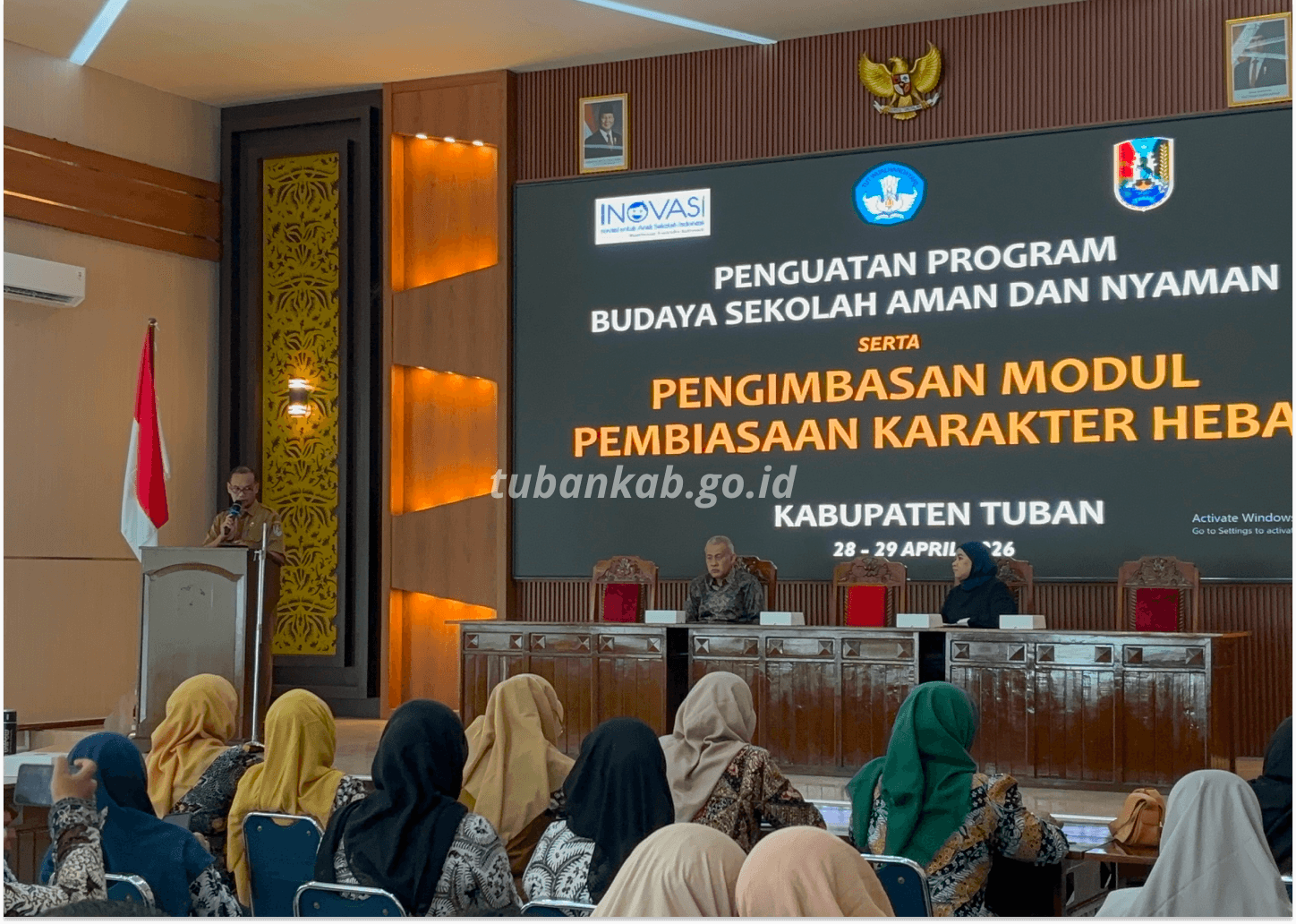 Tubankab - Dalam rangka mewujudkan lingkungan belajar yang aman, nyaman, dan berpihak pada anak, Dinas Pendidikan Kabupaten Tuban bersama INOVASI Jawa Timur menggelar diseminasi Modul Budaya Belajar Aman, Nyaman, dan Gembira pada 28–29 April 2026 di Aula Disdik Tuban. Kegiatan ini menyasar pengawas SD se-Kabupaten Tuban dengan melibatkan Ketua Kelompok Kerja Kepala Sekolah (KKKS) serta perwakilan guru kelas rendah dan tinggi dari tiap kecamatan.