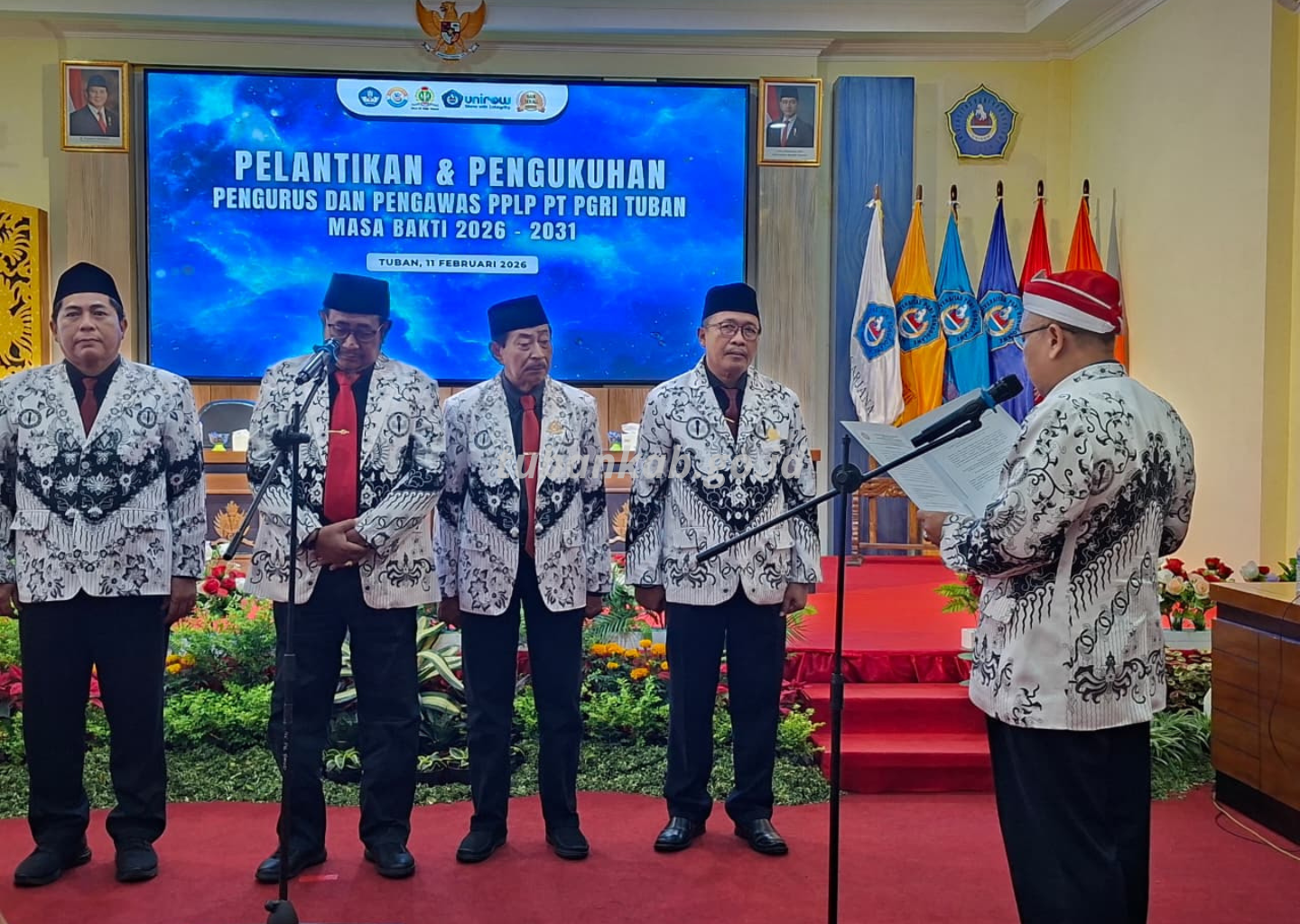 Tubankab - Sudjarwoto, SH, S.Pd, M.H., MM., M.Hum resmi kembali dikukuhkan sebagai Ketua Perkumpulan Pembina Lembaga Pendidikan Perguruan Tinggi (PPLP PT) PGRI Tuban. Prosesi pelantikan dan pengukuhan digelar di Hall Lantai 2 gedung rektorat Universitas PGRI Ronggolawe (Unirow) Tuban, Rabu (11/02).