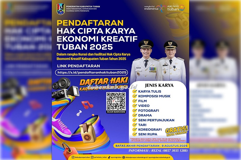 Tubankab – Pemerintah Kabupaten Tuban melalui Dinas Kebudayaan, Kepemudaan dan Olahraga serta Pariwisata (Disbudporapar) membuka pendaftaran fasilitasi Hak Cipta Karya Ekonomi Kreatif tahun 2025. Program ini memberikan kesempatan bagi para pelaku ekonomi kreatif untuk mendapatkan perlindungan hukum atas karya yang dihasilkan, dengan kuota terbatas hanya 25 karya.