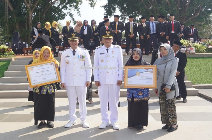 Penghargaan diterima oleh Kepala UPT SMPN 1 Tuban, Umirindiyah, S.Pd., M.M., didampingi Ketua SSK SMPN 1 Tuban, Dra. Indra Sugiarsi, di tengah khidmatnya pelaksanaan upacara peringatan kemerdekaan.