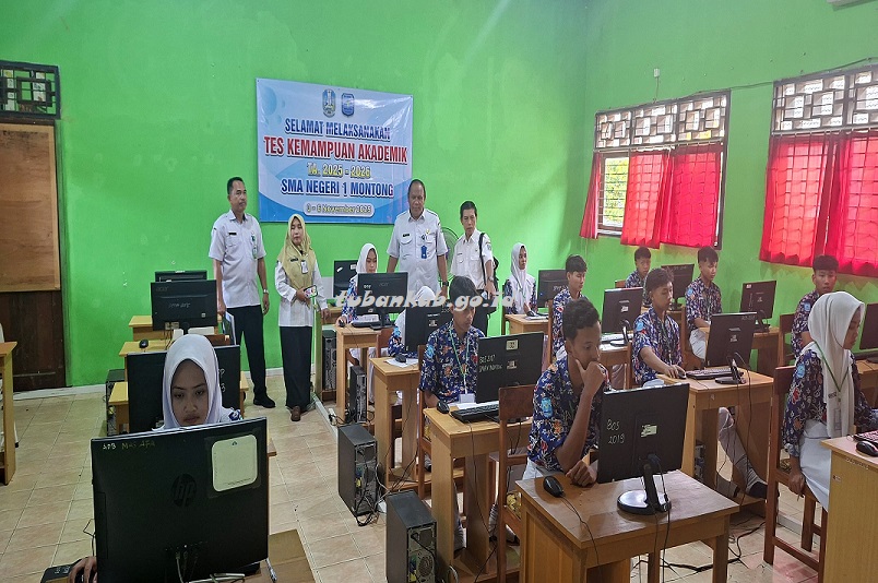 Tubankab - Cabang Dinas Pendidikan (Cabdindik) Wilayah Bojonegoro-Tuban melalui Tim Monitoring dan Evaluasi (Monev) melakukan peninjauan langsung terhadap pelaksanaan Tes Kemampuan Akademik (TKA) di sejumlah sekolah menengah di wilayah kerjanya, salah satunya Sekolah Menengah Atas Negeri (SMAN) 1 Montong, pada Rabu (5/11).